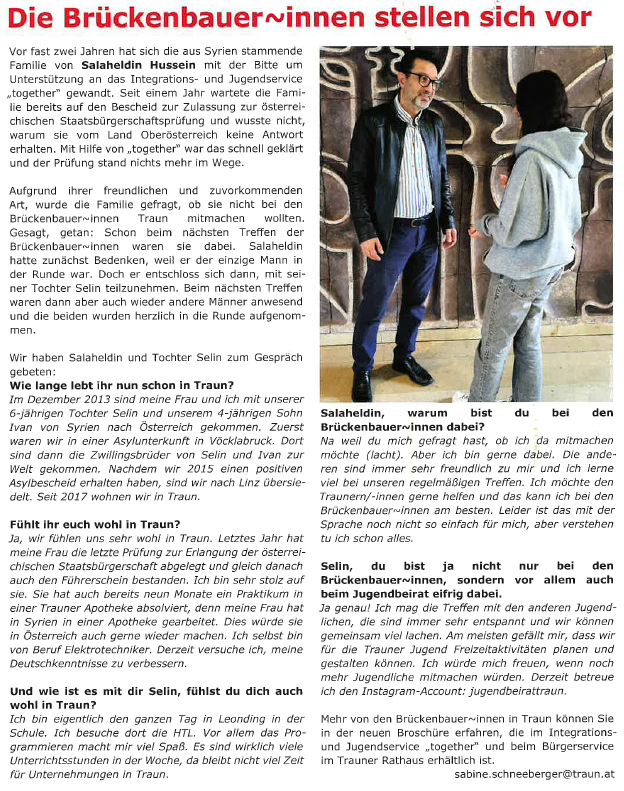 Und hier kommen die BrückenbauerInnen ins Spiel. Ehrenamtliche, die den gegenseitigen Respekt zwischen den Menschen fördern, mehrsprachig über Angebote der Stadt informieren und Einblicke in verschiedenste, kulturelle Gebräuche vermitteln. BrückenbauerInnen wissen, wie und was in Traun läuft. Sie kennen Zuständigkeiten in der Verwaltung und Ansprechpersonen für verschiedenste Anliegen. Das macht sie für neu nach Traun Zugezogene und Alteingesessene zu idealen Ansprechpersonen. So können auch TraunerInnen, die noch nicht so gut Deutsch können, hilfreiche Informationen aus erster Hand erhalten und besser in das gemeinsame Zusammenleben hineinwachsen.